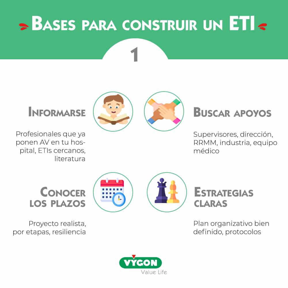 APOYOS FUNDAMENTALES: la dirección de enfermería es un apoyo clave en la creación de un EAV, el equipo médico y recursos materiales pueden ser también de mucha ayuda. No hay que olvidar que la industria tiene un papel fundamental a nivel de material y de formación. Es importante poder contar con una persona de contacto en los servicios que van a manipular los accesos venosos colocados por el EAV, para, de esta manera, tener a alguien que coordine y releve los beneficios del EAV.