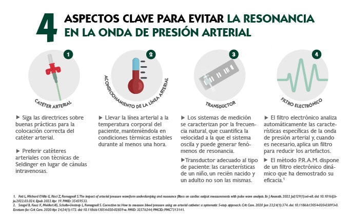 Sabemos que la fisiología de la onda de presión arterial es muy compleja y se deriva de la interacción dinámica entre el volumen sistólico, la compliance arterial, la resistencia al flujo, la rigidez vascular… Hay mucha información en cada latido. Por lo tanto, los artefactos implican datos erróneos en los diferentes parámetros que observamos en el monitor. En un estudio de 2022¹, nos referimos a la sobreestimación del rebote sistólico que se produce habitualmente en casos de resonancia y que a menudo conduce a una sobreestimación del gasto cardíaco cuando se aplica un algoritmo de cálculo (estimación) del flujo (denominado análisis de la onda de pulso o del contorno del pulso) a la onda: