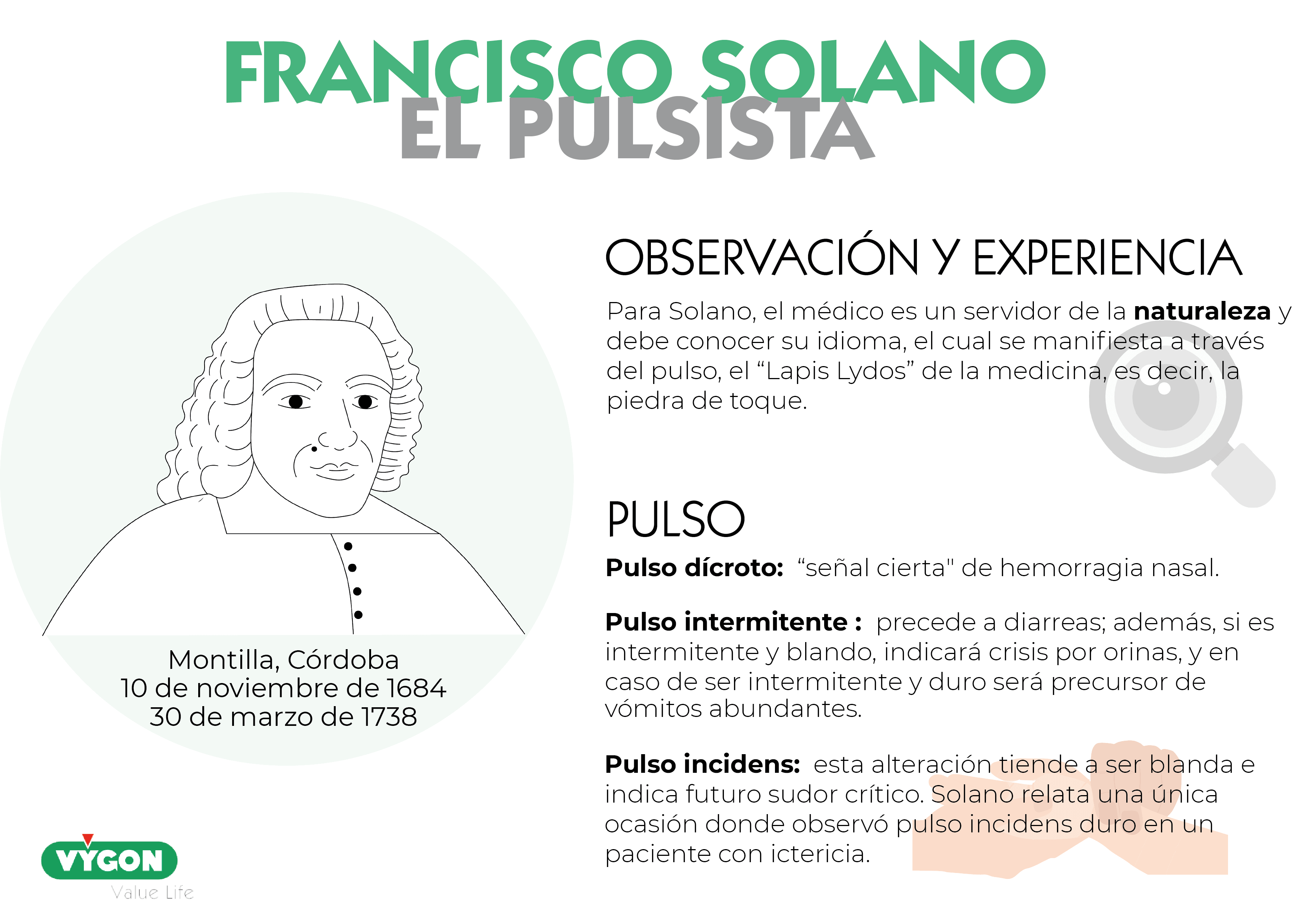 Sin duda, Francisco Solano es uno de los grandes investigadores que ha dejado su huella en la medicina. No sólo aportó su teoría sobre el pulso, también una postura clínica avanzada, según la cual hay que prestar atención a las señales que manda el cuerpo de los pacientes antes de actuar y no dejarse guiar solamente por estudios médicos anteriores, si no también servirse de la propia experiencia y observación.