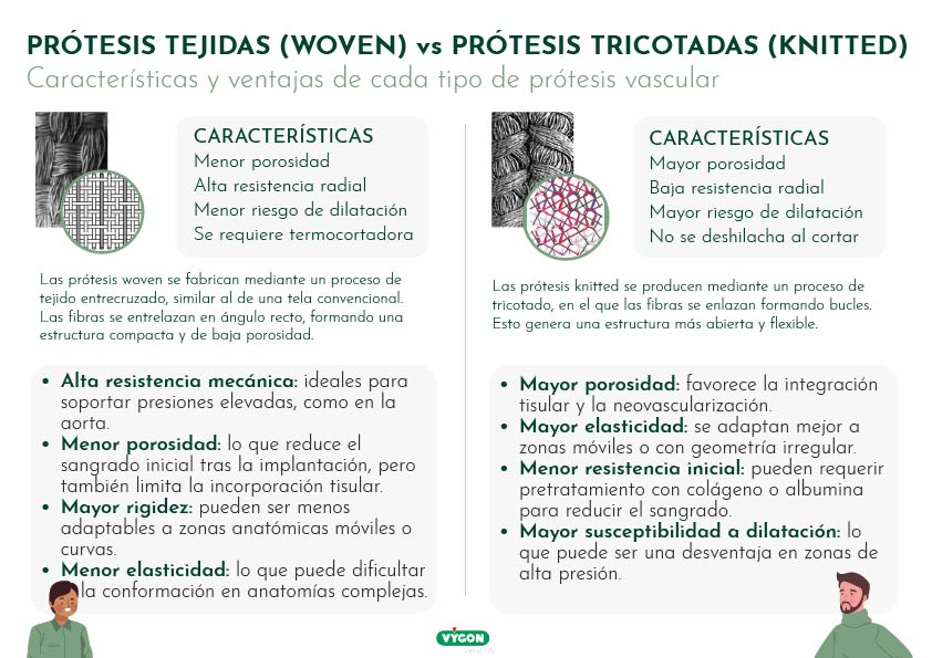 Estas características hacen que las prótesis woven sean preferidas en cirugía de grandes vasos, donde se requiere durabilidad y resistencia.