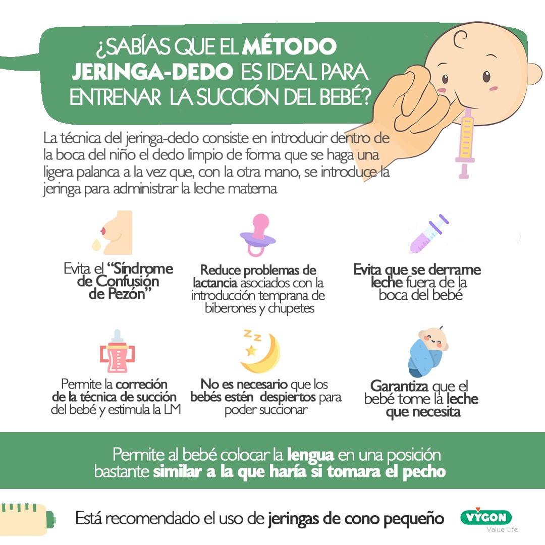 - Técnica dedo-jeringa o finguer-feeding: es un método alternativo para administrar la leche y facilitar el desarrollo de la técnica de succión. Estimula y refuerza el reflejo natural de succión y evite el síndrome de la confusión del pezón que provoca interferencias en la instauración de la leche materna. Se introduce el dedo (generalmente el meñique) en la boca de recién nacido junto con una jeringa de cono pequeño o cánula. El neonato al recibir el estimulo mueve la lengua alrededor de este dispositivo de forma similar a cuando lo hace con el pezón materno. Al estimular la succión, en ocasiones, el recién nacido es capaz de menear ellos mismo el embolo y atraer la leche. Además, fomenta la participación de la familia cuando la lactancia materna no es viable.