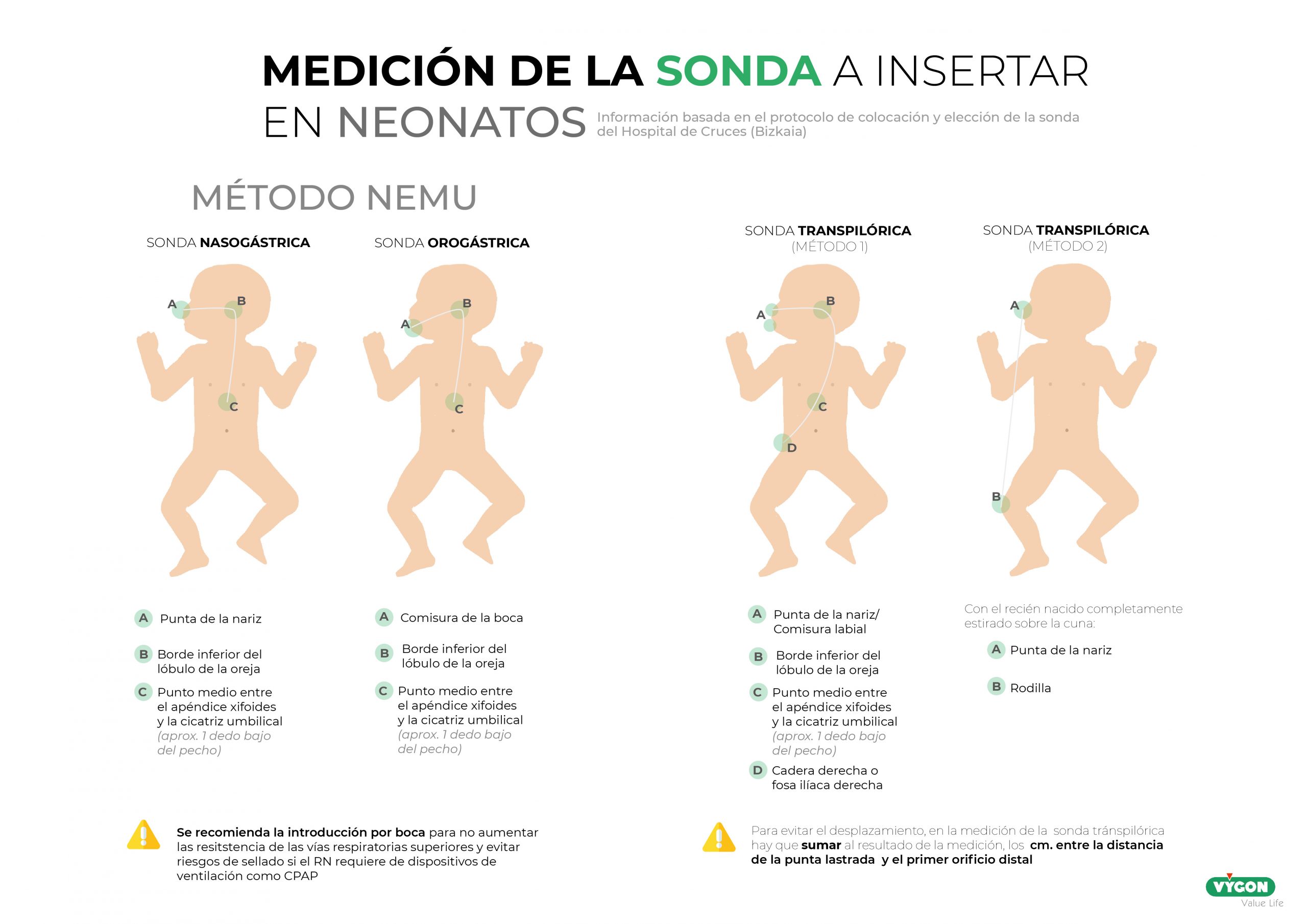 - Método NEMU (consultar imagen⬇): es uno modo de determinar la longitud a introducir de la sonda nasogástrica u orogástrica. En recién nacidos se recomienda, en general, la introducción de las sondas por boca para no aumentar la resistencia de las vías respiratorias superiores o, en el caso de que el bebé requiera de un soporte de ventilación, minimizar los riesgos de escape de presión u oxígeno por un sellado ineficiente.