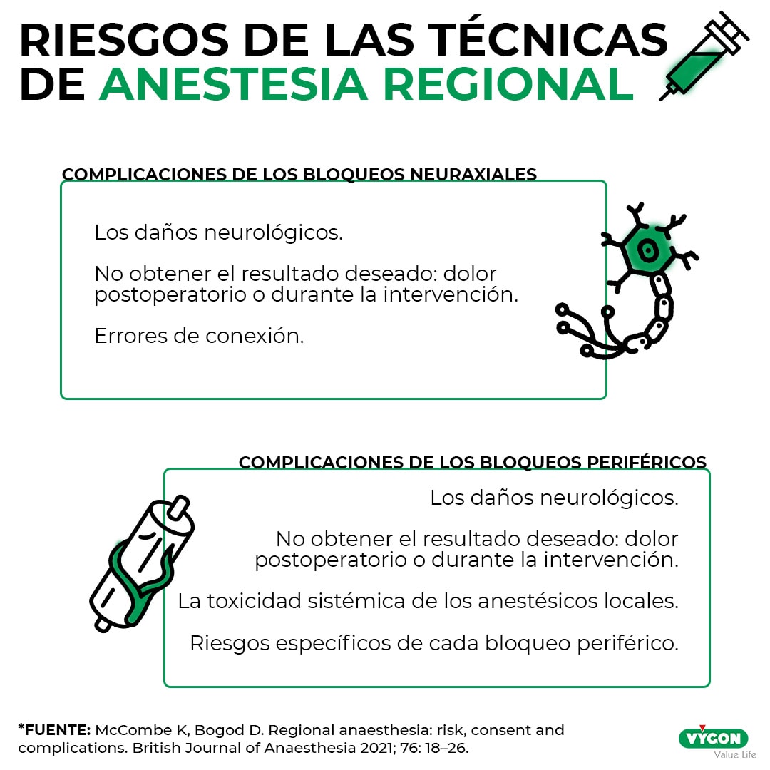 Sin embargo, es evidente que la anestesia regional también implica riesgos y complicaciones concomitantes que no podemos olvidar. Los riesgos de la anestesia regional están relacionados principalmente con la naturaleza técnica del procedimiento, siendo el principal de ellos el neurológico. Aunque es poco frecuente, la relación directa entre el daño nervioso y el procedimiento en sí significa que los pacientes deben ser conscientes de esta complicación cuando se solicita el consentimiento.