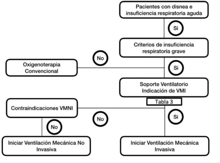 Este sí sería el caso del uso de la VMNI como techo terapéutico para el tratamiento de la IRA. Los autores sugieren su uso en pacientes con orden de no intubar si pertenecen a alguno de los grupos anteriores en los que se recomendaba la VMNI.