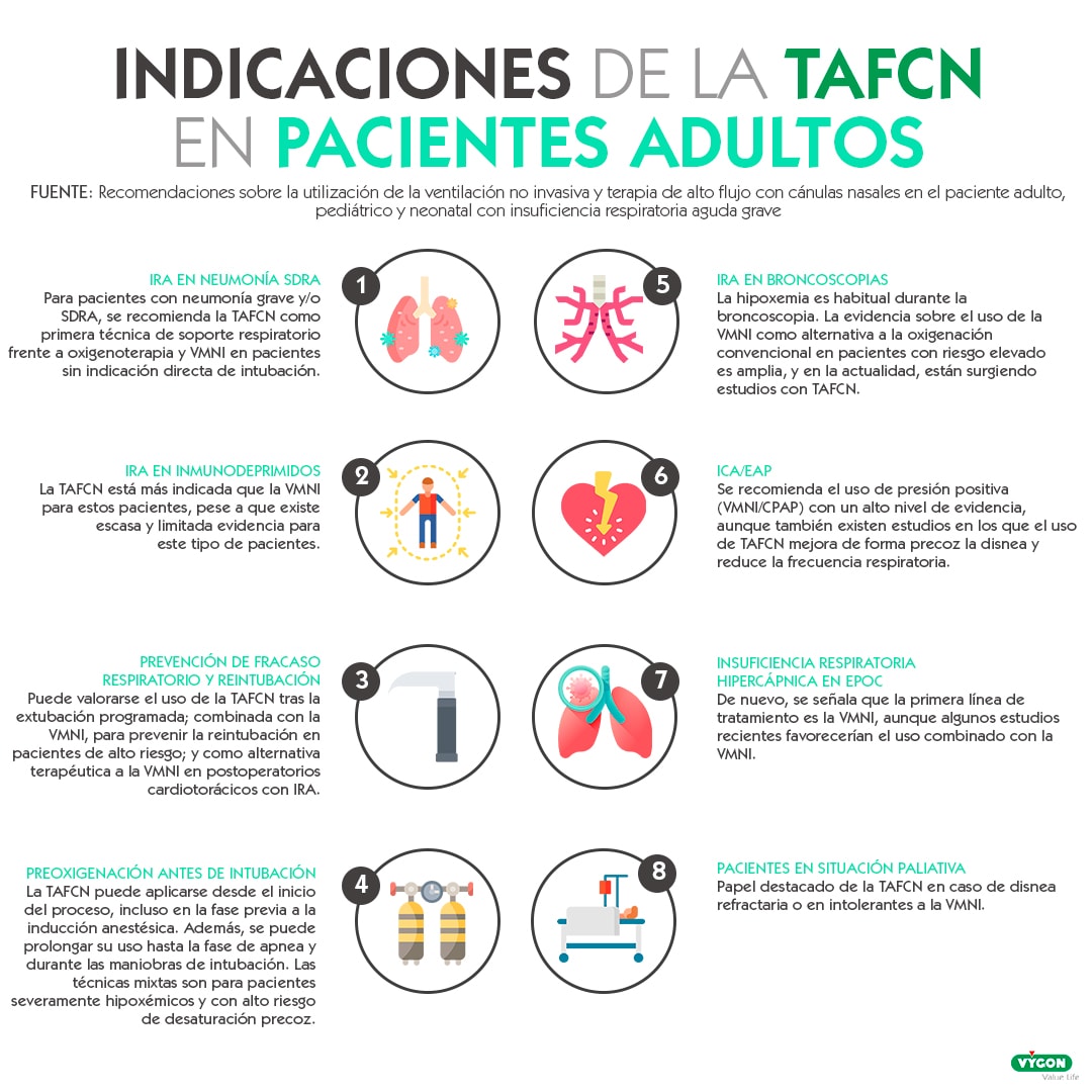 Para pacientes con neumonía grave y/o SDRA, los autores del documento de consenso recomiendan la TAFCN como primera técnica de soporte respiratorio frente a oxigenoterapia y VMNI en pacientes sin indicación directa de intubación orotraqueal.