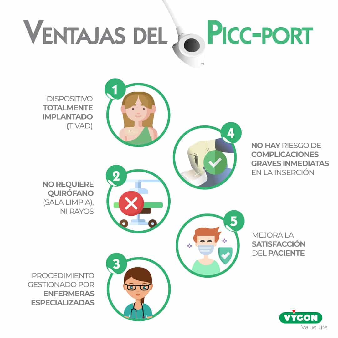 - Ventajas del PICC-port: dispositivo totalmente implantado, no tiene riesgos de complicaciones graves en la inserción, no requiere quirófano (solo sala limpia), aumenta la satisfacción del paciente, es un procedimiento enfermero