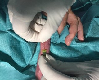 - Retirar la cánula asegurando la posición de la guía (presionar suavemente por encima de la punta de la cánula) para que no se salga