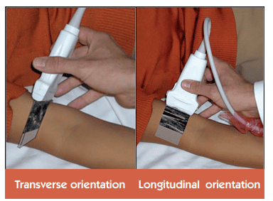 Most ultrasound machines have markers to allow correct orientation. This may be in the form of a groove on the side of the transducer. This groove teams up with an orientation maker on the ultrasound screen. If orientation is incorrect, this can lead to confusion as when the probe is moved to the left, the image will move to the right. Therefore, correct orientation is important.