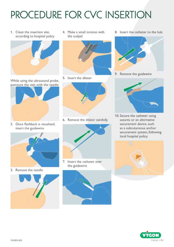 The successful insertion of a central venous catheter relies on a combination of technical proficiency, adherence to evidence-based protocols, and a patient-centred approach. Key procedural elements, including the administration of local anaesthesia, ultrasound-guided vein identification, and the meticulous execution of the Seldinger technique, are essential for minimising risks and ensuring catheter patency. Post-insertion practices such as securement, dressing application, and confirmation of catheter tip placement further contribute to patient safety and procedural success. In summary, CVC insertion demands a high standard of clinical practice, continuous monitoring, and thorough documentation to uphold the quality of care and reduce the incidence of complications.