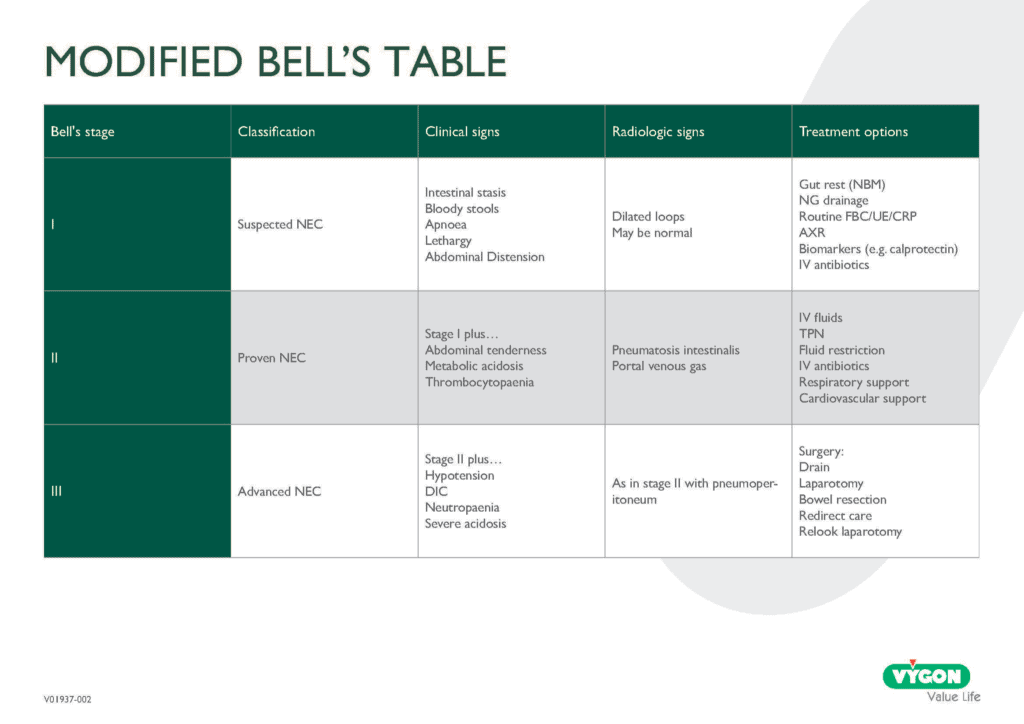 Clinical presentation is often abrupt: abdominal distension, feeding intolerance, lethargy, and bloody stools. Diagnosis relies on clinical signs paired with imaging findings such as pneumatosis intestinalis. Early recognition is critical because NEC can evolve from mild inflammation to full intestinal necrosis within hours. Evidence‑based guidelines emphasise rapid staging and management using modified Bell’s criteria to guide interventions from bowel rest and gastric decompression to surgical exploration in advanced disease. [6]