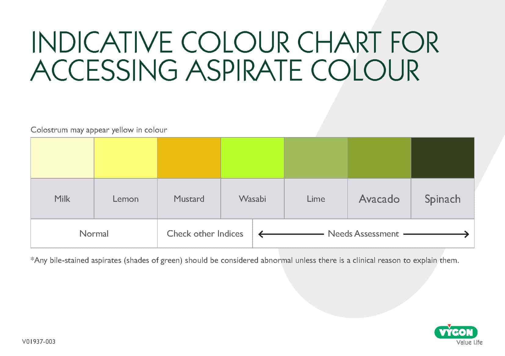 - Assess aspirate colour against the colour chart